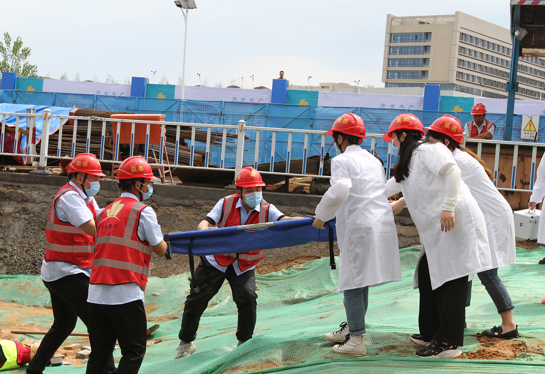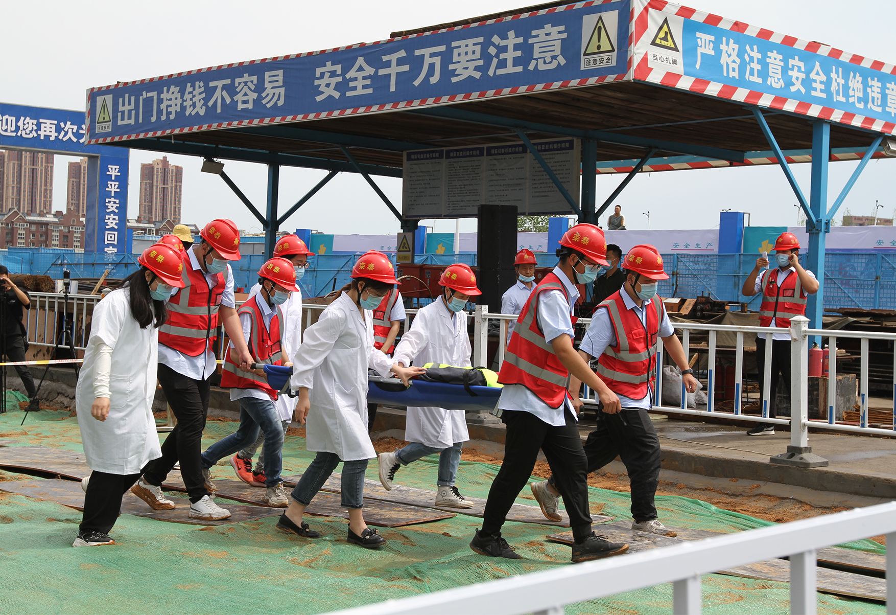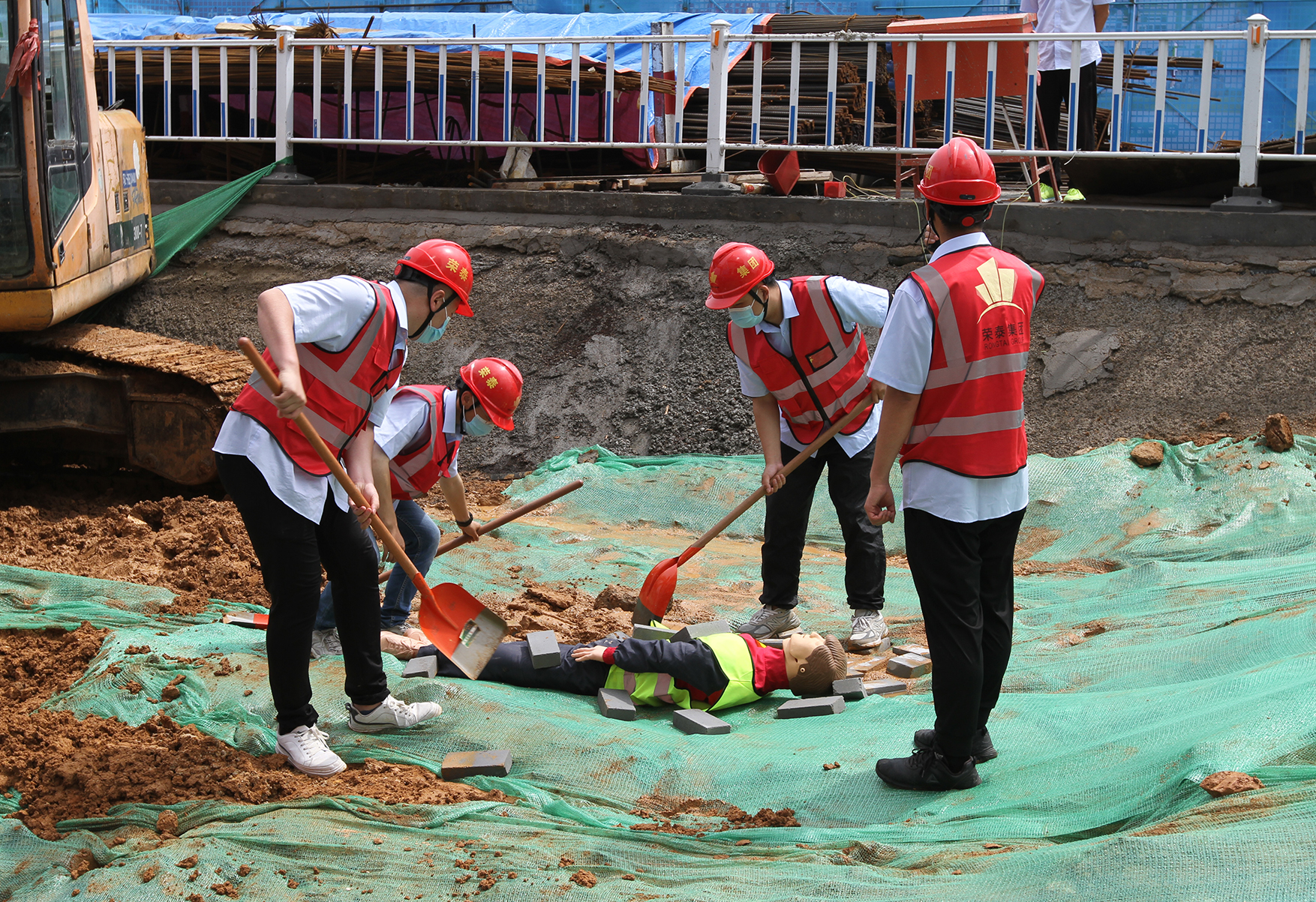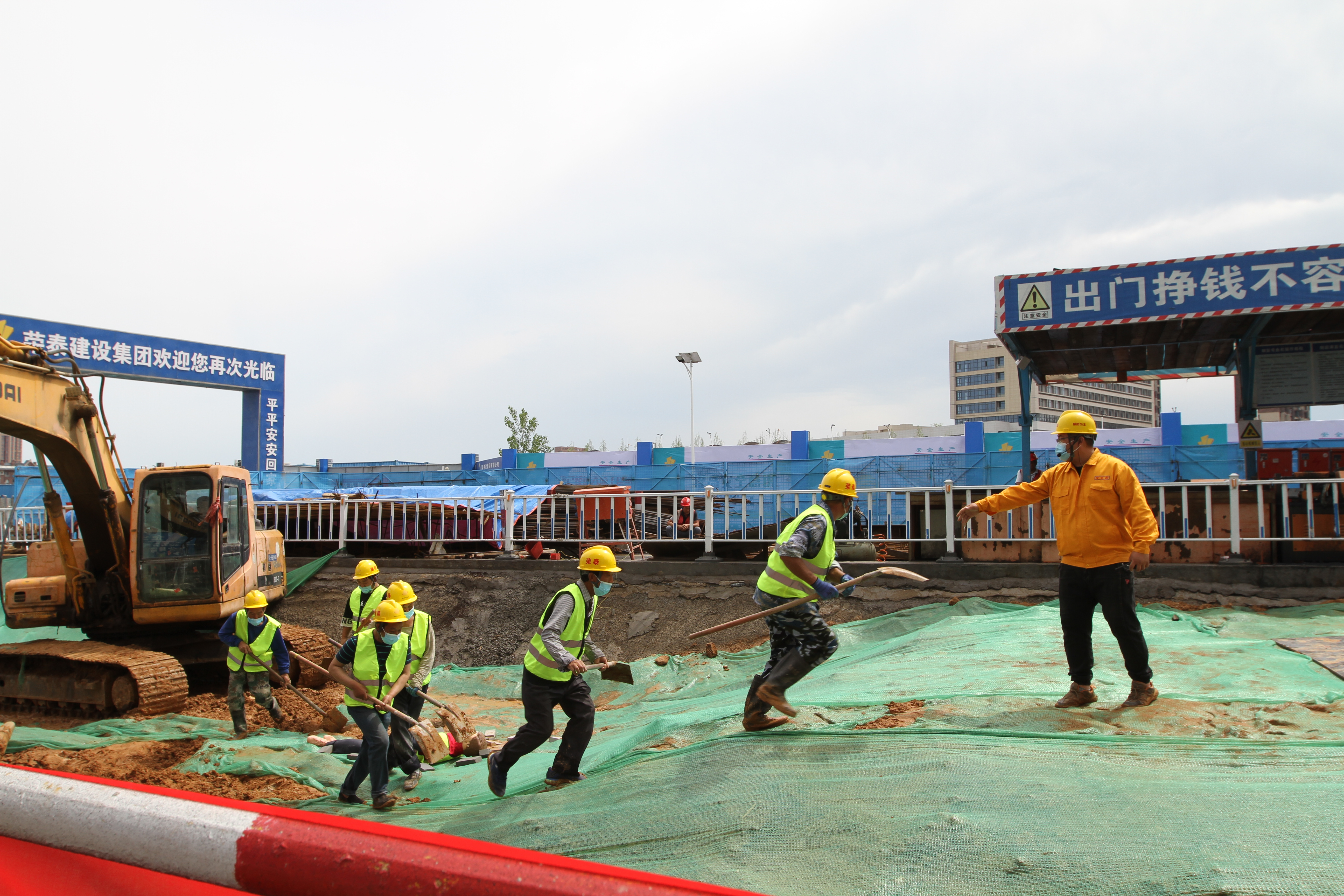 本次应急演练是模拟基坑坍塌事故应急救援的场景,当事故发生时,救援预案启动,上下调动,应急响应,人员疏散,组织抢救,防止事故扩大,最大程度的保障人员群众生命财产损失。
