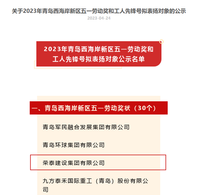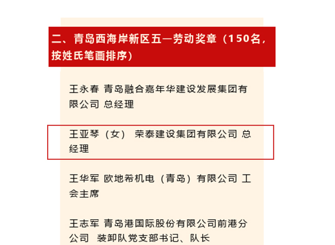 近日,荣泰集团荣获西海岸新区五一劳动奖状。